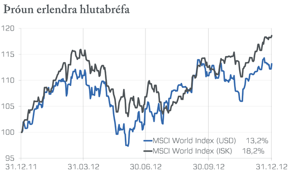 Árið 2012 var viðburðaríkt á erlendum mörkuðum. Erfitt virðist vera fyrir stærstu hagkerfi heimsins að komast aftur á réttan kjöl eftir áföll og viðvarandi vandamál á fjármálamörkuðum. Hagvöxtur hefur almennt farið minnkandi um allan heim síðustu misserin og eru ýmsir þættir sem hafa áhrif þar á. Miklar opinberar skuldir ásamt óvissu í stefnu peningamála í Evrópu eru þó sennilega augljósustu vandamálin. Mörg ríki í Suður-Evrópu eru gríðarlega skuldsett og hefur það í einhverjum mæli leitt til fjármagnsflótta frá Suður-Evrópu til norðurs og jafnvel annarra heimsálfa. Þá er atvinnuleysi hátt á evrusvæðinu og vandséð hvernig hægt verður að ráð bót á því á næstu misserum.Eitt helsta vandamálið í Bandaríkjunum er atvinnuleysi og lítill hagvöxtur en Seðlabanki Bandaríkjanna hefur ítrekað ráðist í aðgerðir til að örva hagkerfið sem felast í aukningu peningamagns í umferð og lækkun vaxta.