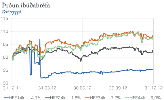Ávöxtunarkrafa óverðtryggðra skuldabréfa hækkaði á árinu sem rekja má til veikingar krónunnar og mikillar verðbólgu í upphafi ársins. Um miðjan marsmánuð voru gjaldeyrishöftin hert með lagabreytingu sem fól í sér að ekki væri lengur heimilt að kaupa erlendan gjaldeyri fyrir andvirði verðbóta og/eða afborgana af höfuðstól skuldabréfa. Krafan á verðtryggðu bréfunum hækkaði í kjölfarið. Þróun á verðtryggðum ríkisskuldabréfum má sjá á myndinni hér að neðan ásamt ávöxtun bréfanna.