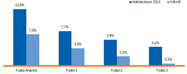 27. janúar 2014Nafnávöxtun fjárfestingarleiða Frjálsa lífeyrissjóðsins árið 2013 var á bilinu 4,2% til 12,6% en þróun verðbréfamarkaða hafði mismunandi áhrif á ávöxtun leiðanna. Verðbólga síðasta árs mældist 3,7%.