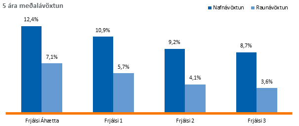 Nafnávöxtun fjölmennustu og stærstu leiðar Frjálsa lífeyrissjóðsins, Frjálsa 1, var 7,7%. Frjálsi 1 er með hæsta vægið í erlendum hlutabréfum af leiðum Frjálsa og hækkaði MSCI heimsvísitala hlutabréfa um 11,5% í íslenskum krónum. Nafnávöxtun Frjálsa 2, sem er með um 84% í skuldabréfum og 16% í hlutabréfum, var 5,8% og nafnávöxtun Frjálsa 3 var 4,2%. Eignir Frjálsa 3 eru fyrst og fremst skuldabréf og innlán. Ávöxtunarkrafa verðtryggðra ríkisskuldabréfa (íbúðabréf) hækkaði þegar leið á árið sem þýðir að verð bréfanna lækkaði. Verðtryggðu ríkisskuldabréfin hækkuðu um 0,2%-4,1%, mismunandi eftir flokkum. Endurspeglast sú þróun í skuldabréfasöfnum leiðanna, þó mest í Frjálsa 3 þar sem ríkisskuldabréf vega hlutfallslega mest í þeirri leið af fjárfestingarleiðum Frjálsa lífeyrissjóðsins.