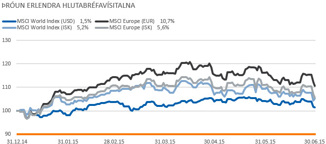 Markaðir beggja vegna Atlantshafsins stóðu ýmist í stað eða lækkuðu lítillega á fjórðungnum. Efnahagsleg áhætta og óvissa hefur að undanförnu verið nokkuð fyrirferðamikil. í Evrópu hefur skuldavandi og möguleg útganga Grikklands úr evrusamstarfinu enn einu sinni skotið upp kollinum og smitaðist sú umræða að nokkru leyti vestur um haf ásamt því að þar halda vangaveltur um mögulegar tímasetningar vaxtahækkana áfram.