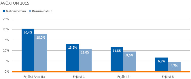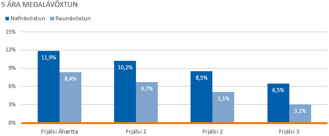 08. janúar 2016Nafnávöxtun fjárfestingarleiða Frjálsa lífeyrissjóðsins árið 2015 var á bilinu 6,8% til 20,4%. Ef meðalávöxtun síðustu fimm ára er skoðuð má sjá að ávöxtun er á bilinu 6,5% til 11,9%. Ávöxtun ársins 2015 var því yfir fimm ára meðalávöxtun hjá öllum fjárfestingarleiðum sjóðsins.