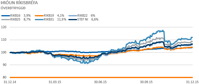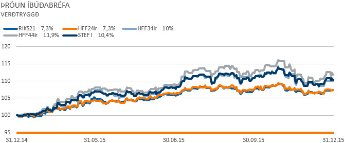 Hvað varðar ávöxtun á árinu í heild þá stóðu verðtryggð skuldabréf betur. Verðtryggð vísitala Stefnis hækkaði um 10% að nafnvirði árið 2015 á meðan óverðtryggð vísitala Stefnis hækkaði um 6% að nafnvirði. Þróun helstu bréfa má sjá á meðfylgjandi myndum.