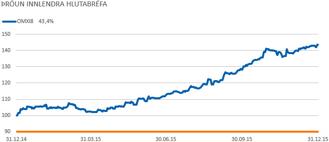 Mikill gangur var á innlendum hlutabréfamarkaði á árinu og hækkaði úrvalsvísitala aðallista Kauphallar Íslands um hátt í 50%. Leita þarf aftur til ársins 2005 til að finna viðlíka hækkun. Heildarviðskipti jukust að sama skapi, úr 276 mö.kr. árið 2014 í 389 ma.kr. árið 2015, eða um 40% á milli ára. Þrjú ný félög voru tekin til viðskipta á árinu, fasteignafélögin Reitir og Eik voru skráð í apríl en fjarskiptafélagið Síminn í október. Félög á aðallista Kauphallar Íslands eru því orðin 16 talsins. Óvissa er um fjölda nýskráninga á þessu ári. Líkur eru á að t.d. Skeljungur, Advania og Ölgerðin verði skráð á aðallistann á árinu en engar tímasetningar eða endanlegar ákvarðanir liggja fyrir.