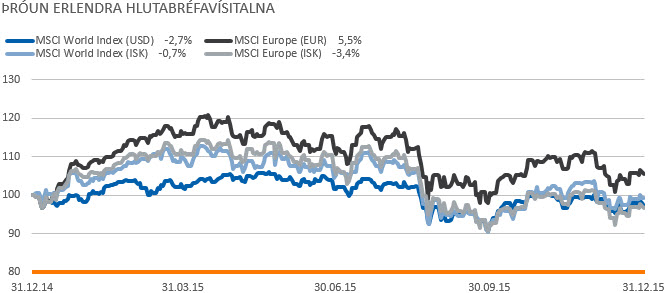 Hlutabréfavísitölur beggja vegna Atlantshafsins skiluðu ávöxtun undir meðallagi á síðasta ári. Vestanhafs og í Evrópu enduðu helstu hlutabréfavísitölur árið nánast á sama stað og þær hófu það. Í Kína voru töluvert meiri sveiflur, í sumar voru áberandi fréttir af miklu verðfalli í kauphöllinni í Sjanghæ, þegar vísitalan þar lækkaði um hátt í 50% á stuttum tíma. Minna var hinsvegar talað um tímabilið fram í miðjan júní þegar sama vísitala hafði hækkað um rúmlega 70%.