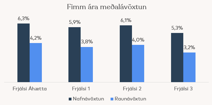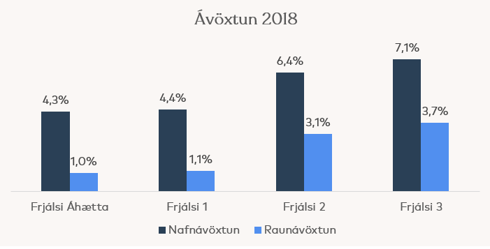 Nafnávöxtun fjárfestingaleiða Frjálsa var á bilinu 4,3% til 7,1%. Við samanburð á ávöxtun ber að hafa í huga að ólíkar fjárfestingastefnur gilda fyrir einstakar fjárfestingaleiðir.