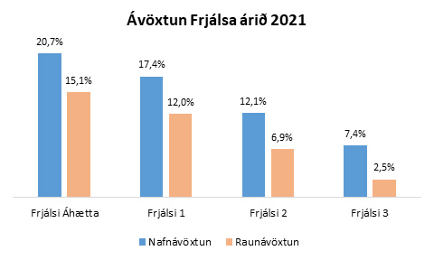 Á liðnu ári hefur ríkt mikil óvissa um efnahagsástand víðs vegar í heiminum vegna Covid faraldursins. Hagvöxtur batnaði verulega frá árinu 2020 og atvinnuleysi minnkaði hraðar en von var á. Aftur á móti hefur verðbólga verið há og reynst heldur þrálát miðað við væntingar. Ef horft er til baka yfir árið í heild má segja að árið 2021 á verðbréfamörkuðum og jákvæð þróun hagkerfisins hafi fyrst og fremst skilað sjóðfélögum góðri ávöxtun. Nafnávöxtun fjárfestingarleiða Frjálsa á árinu 2021 var á bilinu 7,4 - 20,7% sem jafngildir 2,5 - 15,1% raunávöxtun. Ávöxtun tryggingadeildar mun liggja fyrir við útgáfu ársreiknings sjóðsins.