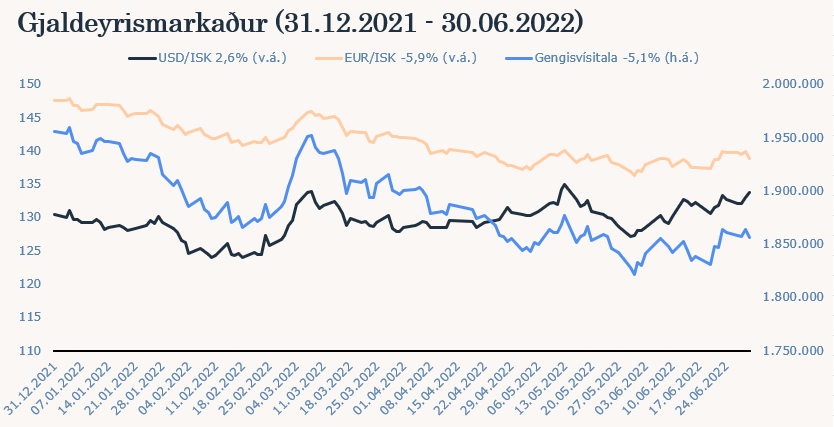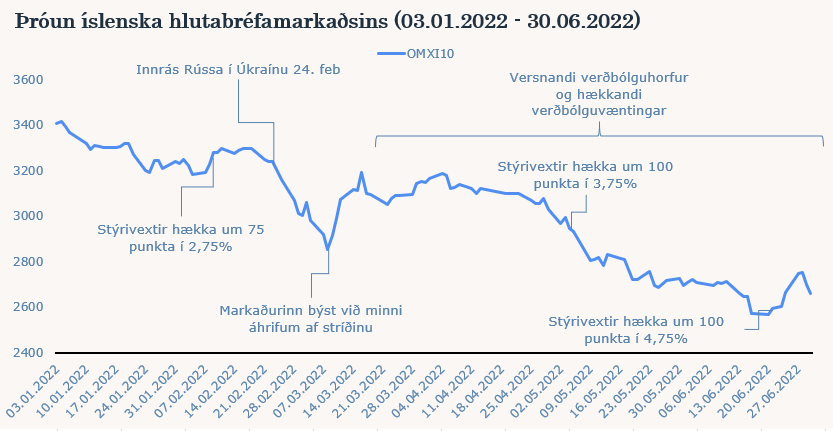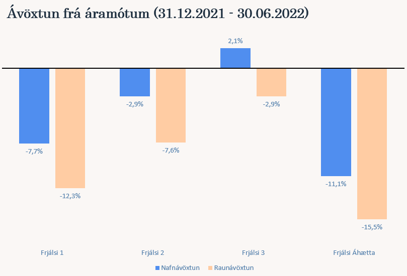 Mikil lækkun hefur verið á innlendum hlutabréfamarkaði það sem af er ári. OMXI10, úrvalsvísitala íslenska markaðsins, hefur lækkað um 21,73% frá árslokum 2021 (31.12.2021 til 30.06.2022). Það má segja að þessi lækkun á félögum innanlands hafi byrjað af alvöru eftir innrás Rússa í Úkraínu þann 24. febrúar. Verðbólga mældist 8,8% í júní og hefur ekki verið meiri frá árinu 2009. Til þess að bregðast við hærri verðbólgu hefur Seðlabanki Íslands hækkað stýrivexti á árinu um 2,75 prósentustig og standa þeir nú í 4,75% en fjárfestar búast við frekari vaxtahækkunum í haust. Þessi mikla verðbólga og hækkun stýrivaxta er meginástæða þeirrar lækkunar sem við sjáum á íslenska hlutabréfamarkaðnum. Ávöxtunarkrafa bæði óverðtryggðra og verðtryggðra innlendra ríkisskuldabréfa hefur hækkað á árinu. Skuldabréfasöfn Frjálsa eru að mestu verðtryggð en vægi verðtryggðra skuldabréfa af innlendu skuldabréfasafni Frjálsa án sjóðfélagalána og ríkisskuldabréfasjóða var 87% í lok júní.