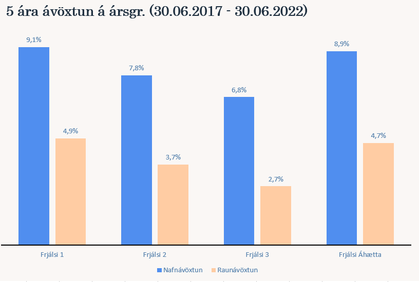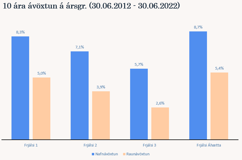 Ávöxtun síðustu ára hefur verið afar góð en árið 2021 var með þeim bestu frá upphafi sjóðsins. Nafnávöxtun Frjálsa áhættu var t.a.m. 20,7% og ávöxtun Frjálsa 1 var 17,4% en þá var innlendi hlutabréfamarkaðurinn mjög kraftmikill. Ávöxtun lífeyrissjóða er í eðli sínu háð markaðsaðstæðum hverju sinni, til skamms tíma getur ávöxtunin verið sveiflukennd en það sem skiptir mestu máli er að raunávöxtun til langs tíma sé jákvæð. Á þessari stundu siglum við í ólgusjó sveiflna á fjármálamörkuðum og þ.a.l. hefur nafnávöxtun sjóða Frjálsa ekki verið jafngóð og undanfarið ár. Verðbólgan bætir síðan gráu ofan á svart og bítur mikið á raunávöxtun sjóðsins. Þegar markaðir hafa lækkað mikið birtast líka tækifæri sem hægt er að nýta sér, það á sér t.d. stað þegar góð félög hafa verið undirverðlögð í allri ringulreiðinni. Langtímaávöxtun sjóðsins hefur verið góð, á myndunum hér fyrir neðan má sjá meðalávöxtun Frjálsa lífeyrissjóðsins til 5 og 10 ára m.v. 30. júní ásamt ávöxtun sjóðsins frá áramótum. Nafnávöxtun Frjálsa 1 til 10 ára á ársgrundvelli hefur t.a.m. verið 8,3% og raunávöxtun 5% sem verður að teljast afar góð ávöxtun.