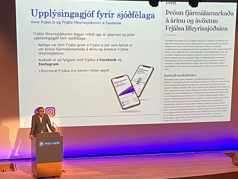 Arnaldur Loftsson, framkvæmdastjóri Frjálsa lífeyrissjóðsins, stýrði fundinum sem hófst með erindi Hjörleifs Arnar Waagfjörð, forstöðumanns eignastýringar fagfjárfesta hjá Arion banka, um þróun verðbréfamarkaða og ávöxtun Frjálsa til skemmri og lengri tíma. Í máli Hjörleifs kom fram að m.a. stríðið í Úkraínu, vaxtahækkanir og há verðbólga hefði leitt til þess að ávöxtun flestra eignaflokka væri óhagstæð á árinu sem hefði haft neikvæð áhrif á ávöxtun fjárfestingarleiða sjóðsins. Aftur á móti væri langtímaávöxtun Frjálsa góð en töluverð óvissa væri um þróun mála næstu misseri.