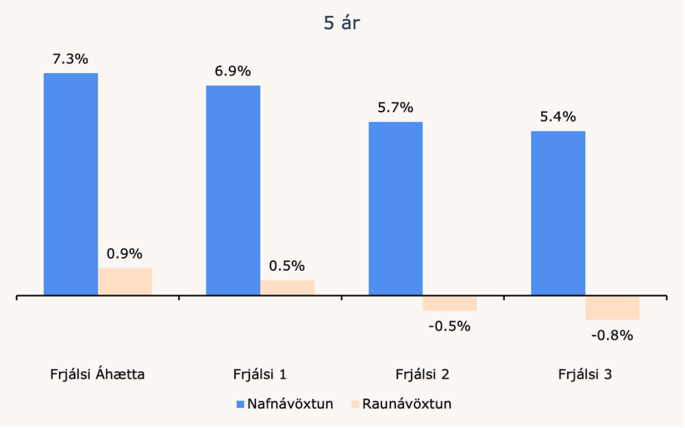 Hér fyrir neðan má sjá ávöxtun á ársgrundvelli til 5 ára og 10 ára m.v. 30.09.2025 . Þegar horft er á lengri tíma sparnað eins og lífeyrissparnað er mikilvægt að minna sig á að ávöxtun til lengri tíma er það sem mestu máli skiptir og ekki er óeðlilegt að það verði nokkrar sveiflur á milli ára. Þá eru sveiflur í áhættumeiri fjárfestingarleiðunum alla jafnan meiri á milli ára en á móti koma væntingar um hærri langtímaávöxtun.
