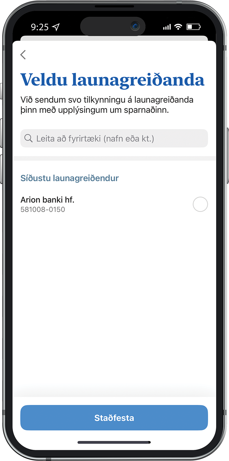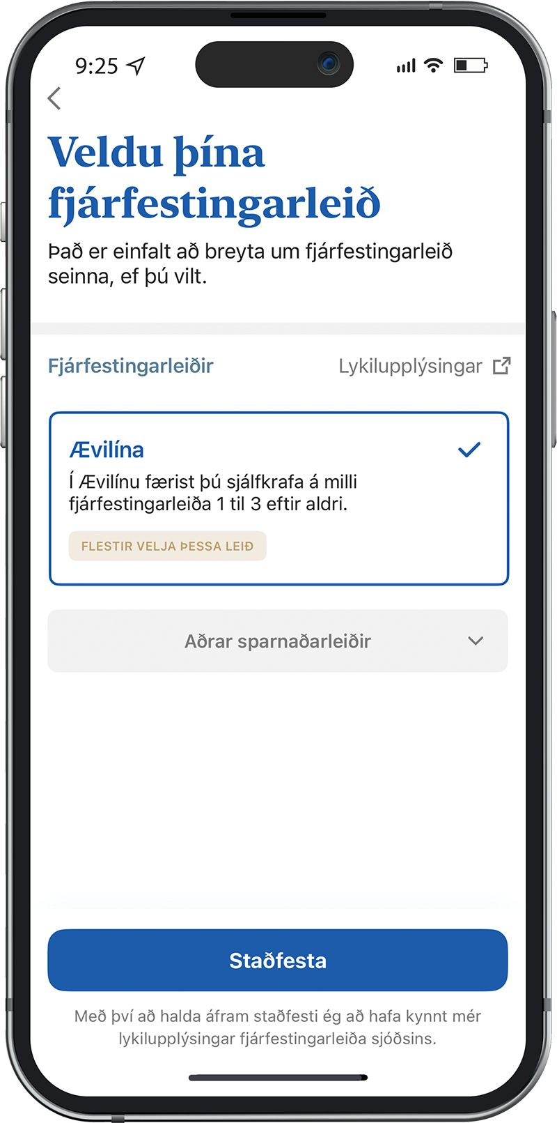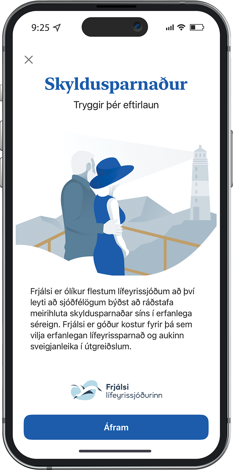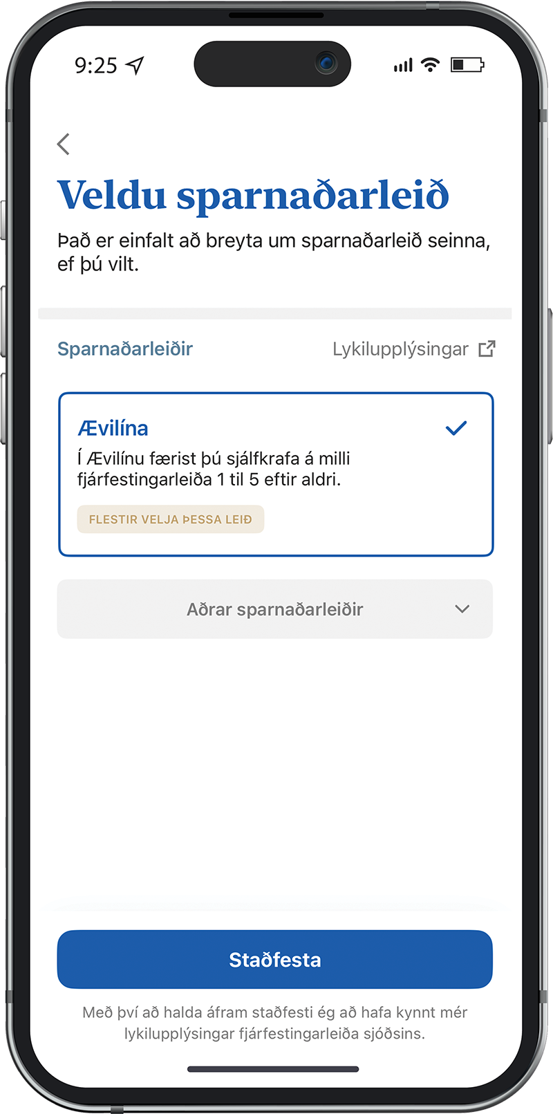 Smella á Sækja um lífeyrissparnað undir flipanum Meira og Lífeyrir í Arion appinu. Velja Skyldusparnað. |